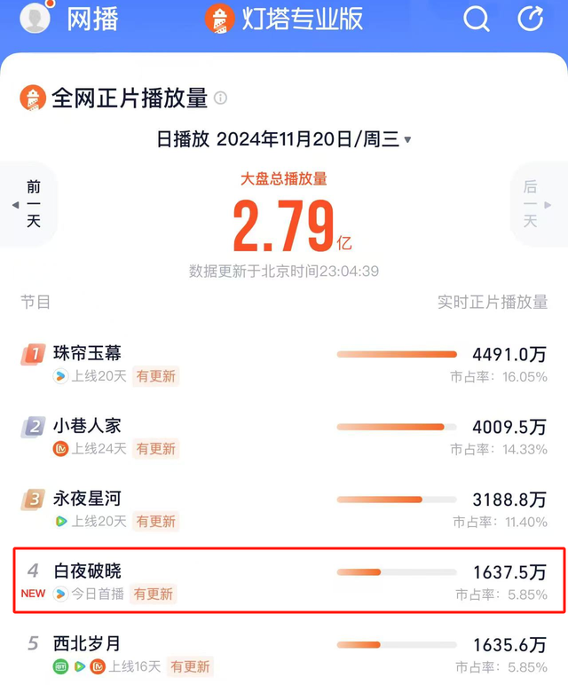 如今才播出了5集,就冲上了寰宇电视剧集聚播放量的第四名,何况以这个速率来看,只需两天的本事,《白夜破晓》就能高出《珠帘玉幕》,成为全网第一。