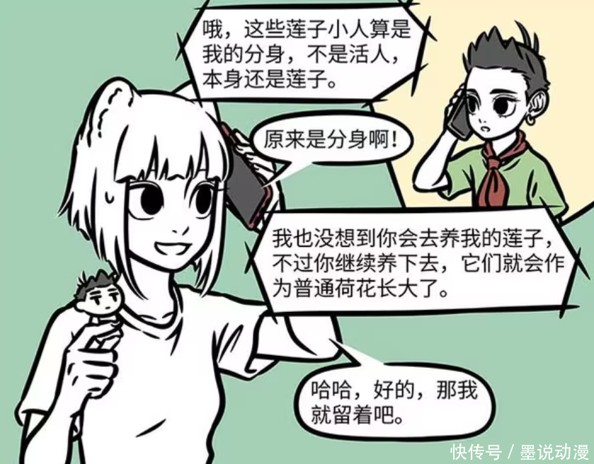 《非东说念主哉》漫画版中,哪吒的头顶不仅不错长出荷叶和荷花,也能结出莲蓬,也就能产出广漠莲子。九月把这些莲子拿去种,最终长出广漠小哪吒。哪吒告诉九月,这些算是他的分身,不是活物。仅仅没念念到九月懒得养,将它们一齐齐煮了。