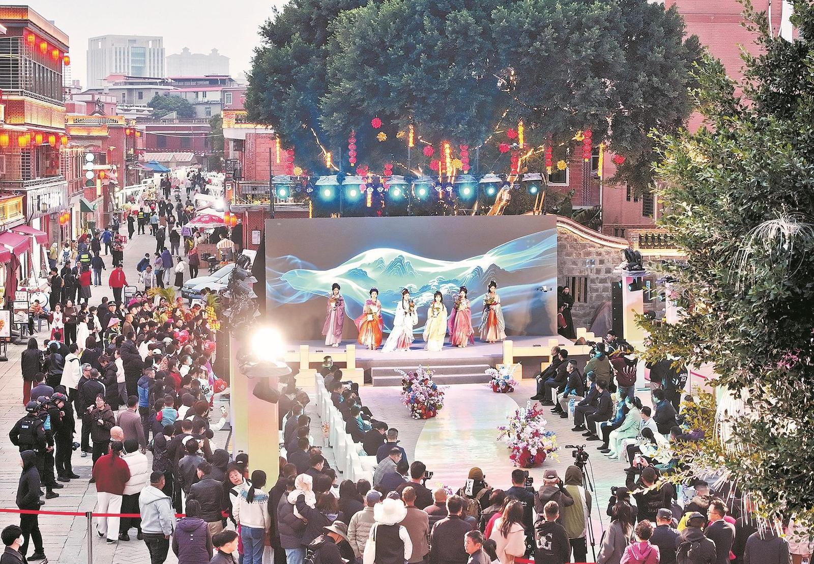 2月6日,旅客们在泉州市洛江区桥南古街不雅看“古桥映喜”前卫风范秀。