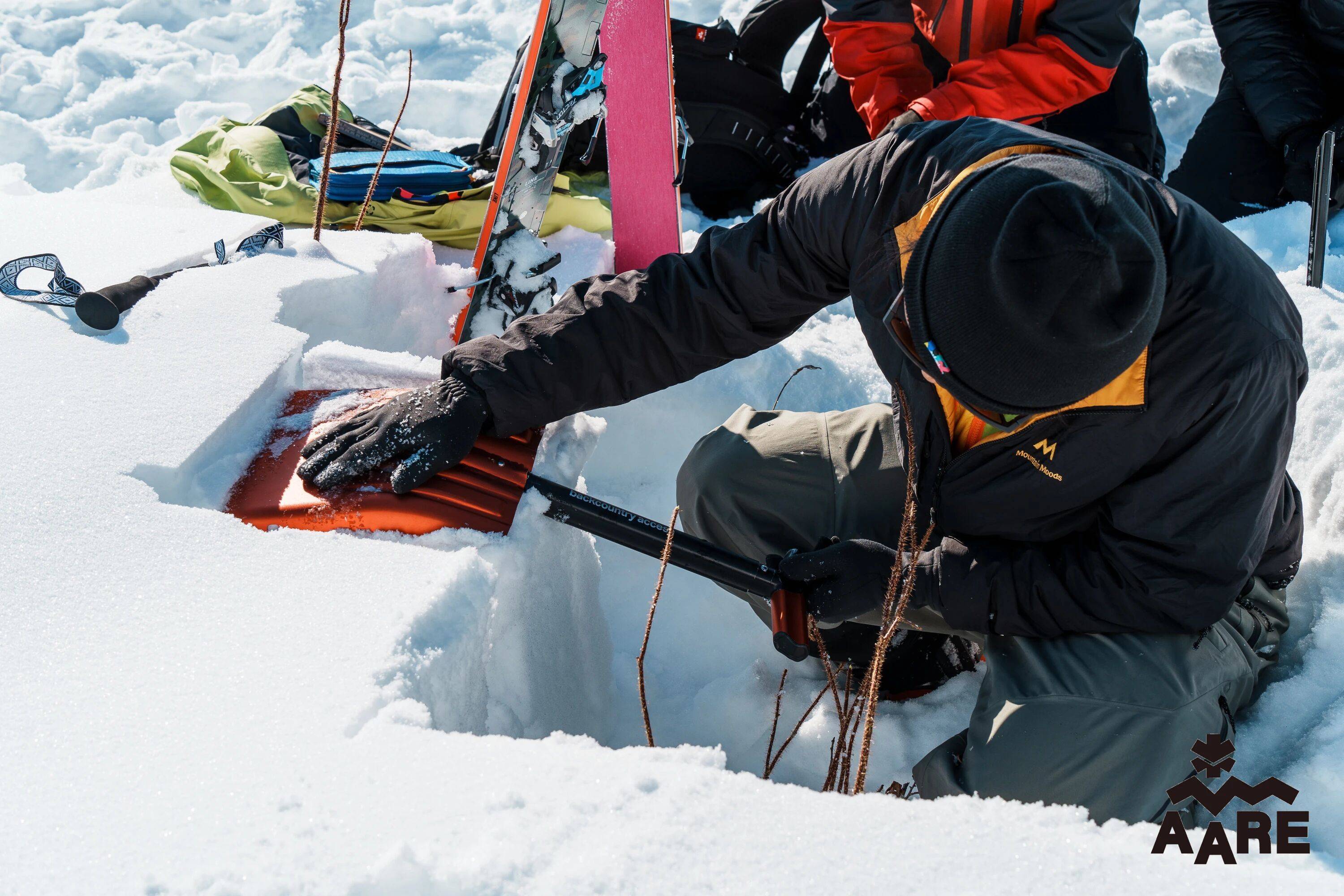 彭超(前)向雪友演示雪层分析粉雪富集地带需晋升雪崩管控水平