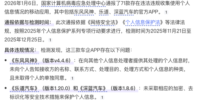 与此同期,笔据最新讯息:1月6日,有71款APP被通报存在不法违法汇注使用个东谈主信息情况,其中包括东风风神、乐谈、深蓝3家汽车企业APP。