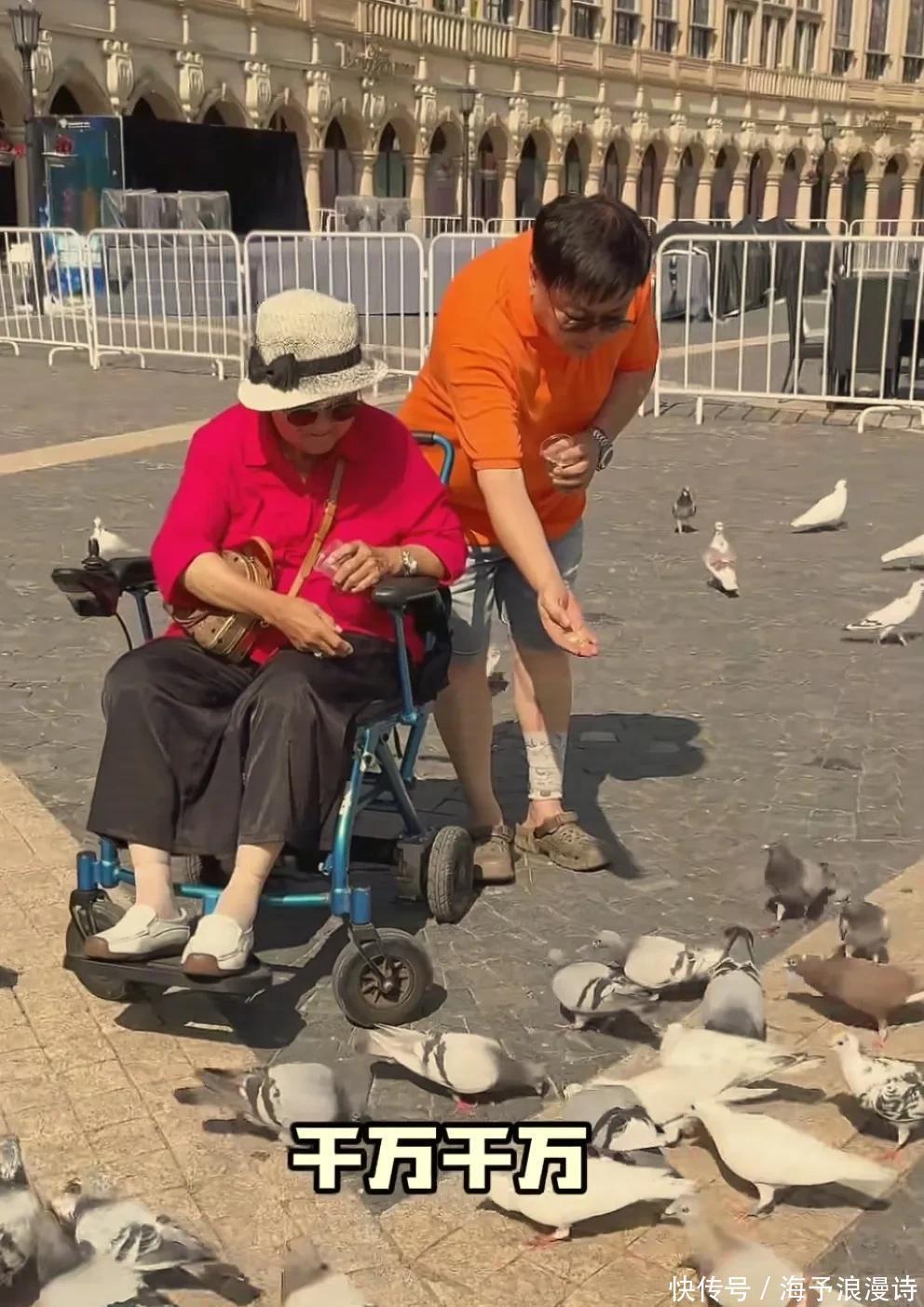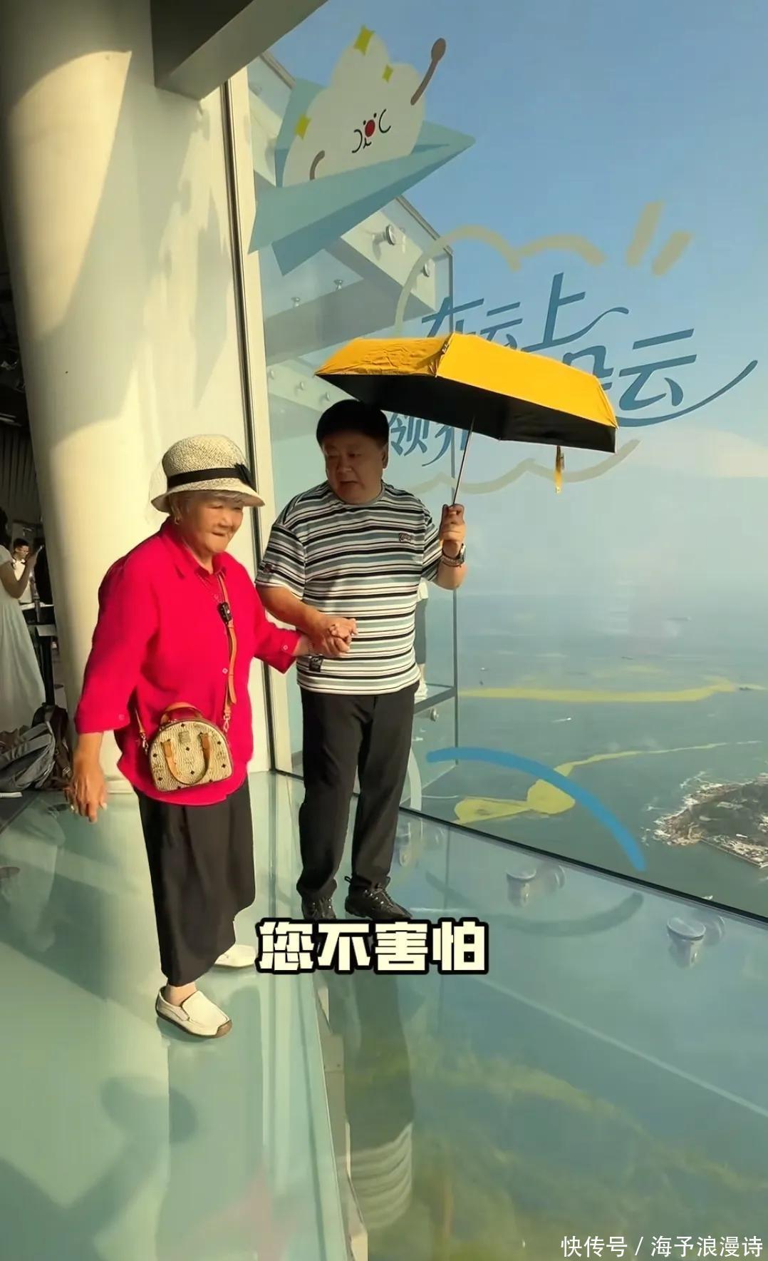 在临海的一座高楼的不雅景阳台,视线相称好,海景尽收眼底,况兼地板是高强度的玻璃作念的,站在上头不雅景,需要一定的勇气;可老佳耦极少齐不发怵,神色自如心不跳,很牢固地走了上去。