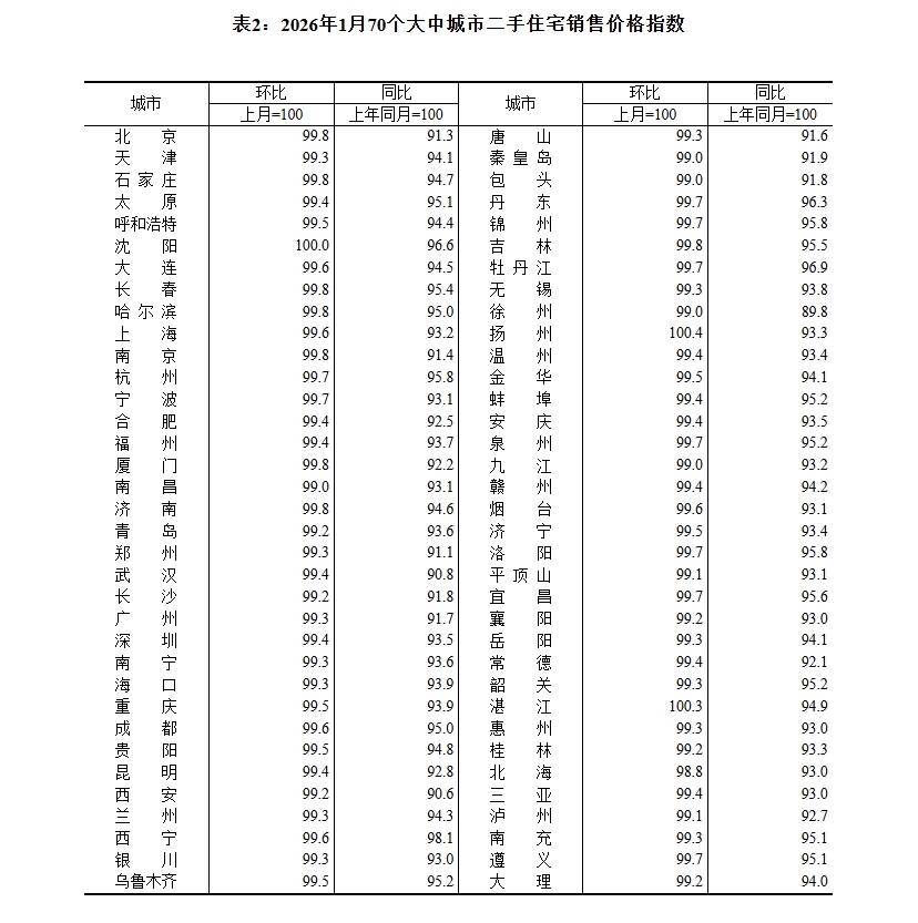 表2:2026年1月70个大中城市二手住宅销售价钱指数