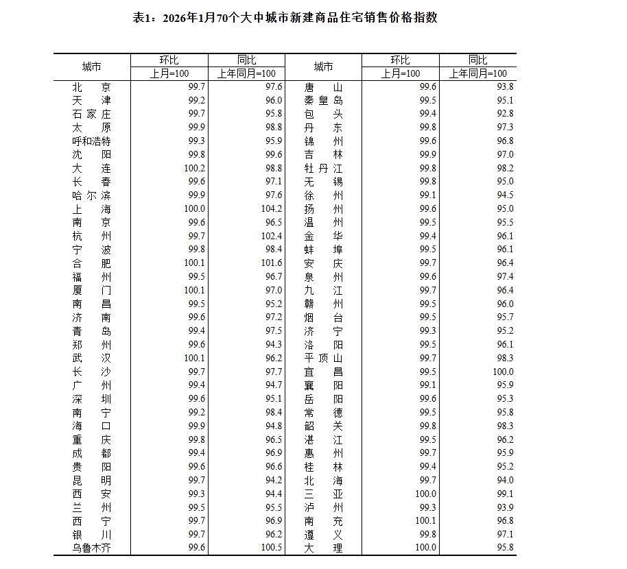 表1:2026年1月70个大中城市新建商品住宅销售价钱指数
