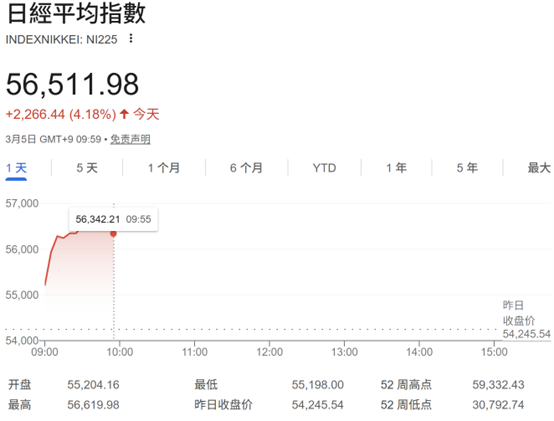 日经225指数开盘涨1.77%,截止发稿,涨幅扩大至逾4%。此前一日,日经225指数收跌3.61%,报54245.54点。