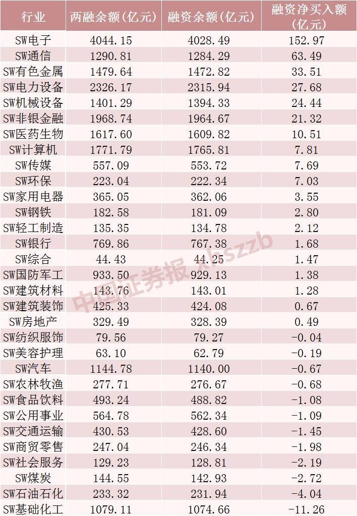 从行业情况来看,上周申万一级31个行业中有19个行业融资余额加多,电子、通讯、有色金属行业融资净买入金额居前,分手为152.97亿元、63.49亿元、33.51亿元。在融资净卖出的12个行业中,基础化工、石油石化、煤炭行业融资净卖出金额居前,分手为11.26亿元、4.04亿元、2.72亿元。