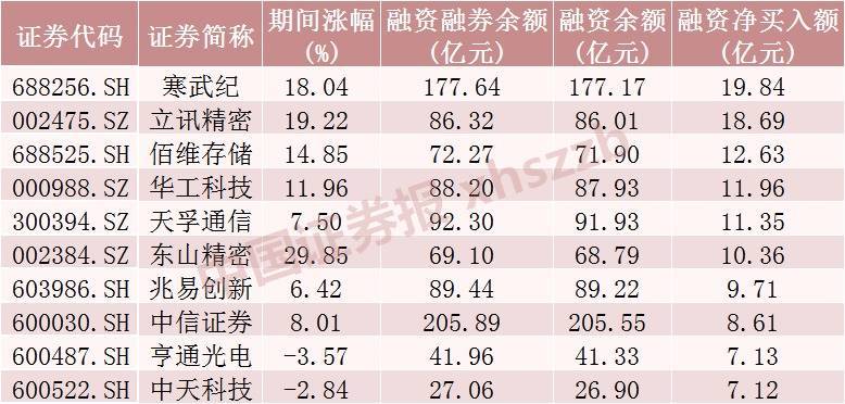 从个股情况来看,上周融资客对135只股票加仓金额超1亿元,加仓居前的10只股票分手为寒武纪、立讯精密、佰维存储、华工科技、天孚通讯、东山精密、兆易立异、中信证券、亨通光电、中天科技,分手净买入19.84亿元、18.69亿元、12.63亿元、11.96亿元、11.35亿元、10.36亿元、9.71亿元、8.61亿元、7.13亿元、7.12亿元。从商场进展看,上周融资客加仓前十的股票大皆高潮,涨幅最大的东山精密涨近30%。