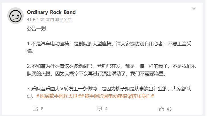 极目新闻记者贯注到,在挑剔区有不少网友对“阿珍”离世留言是曲外,还有网友对“电动座椅架”暗示不明,不少网友误认为是汽车的电动座椅。13日晚,“庸碌摇滚乐队”再次发布公告称,并不是汽车电动座椅,是剧院的大型座椅,但愿全国不要上当上当。