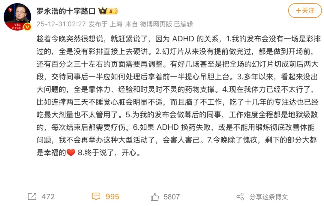 先看罗永浩微博中的第1点“发布会莫得彩排”和第2点“幻灯片作念不完”——这些合适成东谈主ADHD的典型症状。
