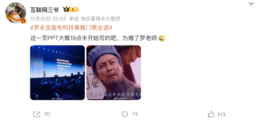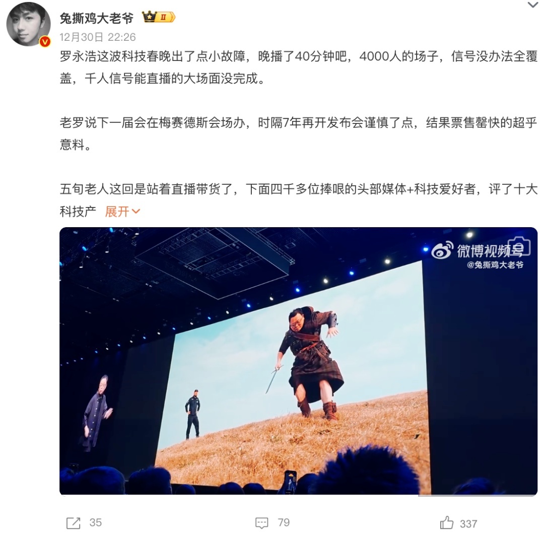 12月30日的发布会,罗永浩又又又迟到了。上场后他示意“发生了一些事情,向人人境歉。后续会发文表现一下,但愿人人走漏”。于是今早网友们醒来,看到了这样一条微博。